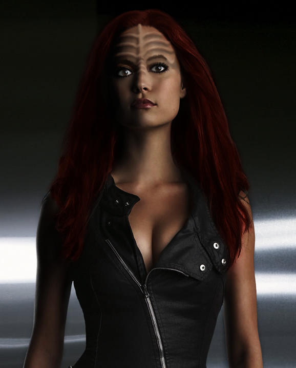 Physical Description | Somewhat short, but lithe and taut with a clearly sculpted, well cut musculature. A delicate blending of masculine strength and curvaceous feminine attributes that are well held and framed by the black, curve-hugging paneled leather bodice, intricately stitched with golden edging. The ankle length, paneled skirt matches the design of the bodice, touching the top of dangerous looking horned boots. Her meticulously toned and well tanned arms are bare, her communicator clipped to a metallic cuff around her left bicep. Black leather, finger-less, horned gloves adorn strong, work worn hands, the nails at the tips of her fingers are kept neatly trimmed. When eyes finally move upwards, they are met with a dangerously inquisitive gaze. Her eyes, the color of warm chocolate, can flash either the light of good humor, or the soul withering glare of rage. The bony ridges of her forehead almost seem to form a feminine battle crown that rests on the top of a feminine yet unyielding, olive complected face. The mane of dark auburn hair that cascades over her shoulders and to the middle her armor shielded back is tied off in a myriad of tiny braids, some of which are gathered behind her head and clasped by a burnished steel hairpin in the shape of the Klingon trefoil. The sash that hangs from her left shoulder, clasps just on the right hip and is made of a paneled, supple dark brown leather. Mid sized golden rings are stitched along the length of either edge, the symbol of the Empire adorning the shoulder, the symbol of her House below that. She wears at least one blade, hanging from her belt, the crest of her House clearly visible on the pommel, while on the other hip hangs her standard issue disruptor. |